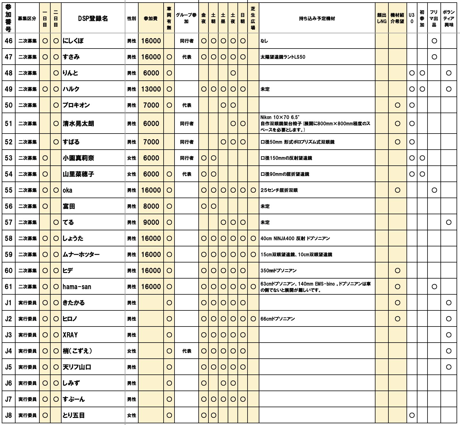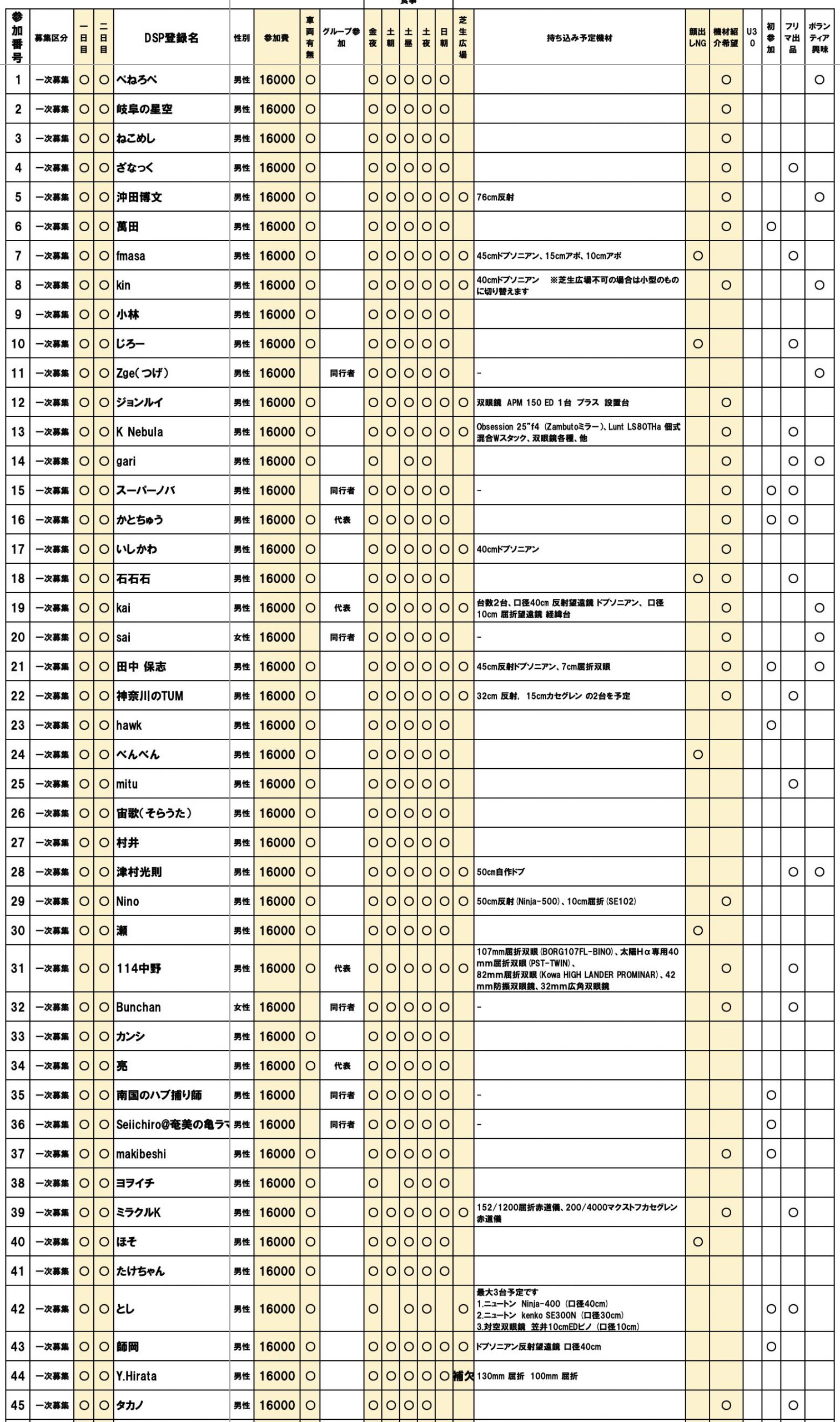 • 申し込まれた方は本リストをご確認くださるようお願いいたします。参加日程、食事の希望や芝生広場の使用、参加費、車両の有無などをご確認お願いいたします。